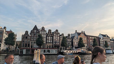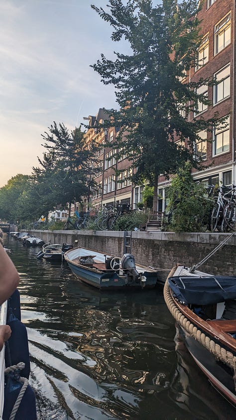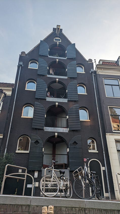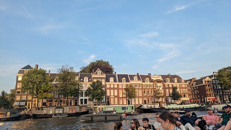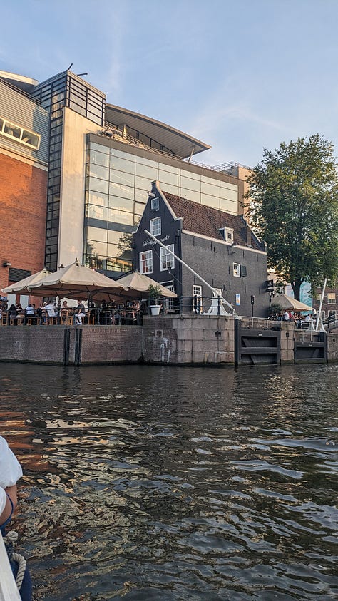 When I checked into my hostel (Durty Nelly’s) on the fourth floor of a red light district row house with classically steep stairs, nobody was socializing. So I charged my phone a bit and booked the last ticket on a cheap sunset canal boat tour. Things are very easy to book when you're alone! You do have to put up with some perceived judgement when you're the only one alone in the whole boat, but when a tour is going on, it's a little easier to turn off that social awkwardness radar. I learned on the tour that the three XXX on the Amsterdam flag stood for the flooding, fires, and plague the city had survived. Later on someone corrected me that they stood for valiant, decisive, and merciful, which I like a lot better and choose to accept as truth. When a city is this old, I think I can do that.