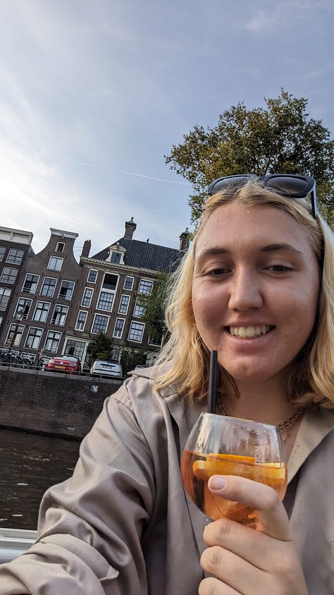 I'm writing this from my own personal cabin in the Stena Line ferry from Hoek van Holland to Harwich port in the UK! This is essentially a cruise ship (featuring a casino, several bars, and a cinema where they're showing Barbie) but for an eight hour overnight journey, and it's also the only place I've stayed with my own room/shower in five days, which makes it feel so luxurious. To get to the port I took a train from Amsterdam to Rotterdam, and then a metro from Rotterdam to the check-in office, which I nervously arrived at about 40 minutes too early. I passed through customs (which side note, has been a little awkward as a young American solo traveler in the Netherlands with a recognizably Dutch surname) and exalted in dropping my luggage off at my private suite. The first thing I did was shower without bringing a change of clothes into the bathroom with me and (TMI?) lay naked on the bed for about an hour. It's the simple pleasures. Then I rearranged some of my luggage/packing, wandered the upper deck, pulled some GBP from at ATM and used up the last of my Euro cash on a sparkling wine, which I sipped while watching the Holland horizon slip into the distance.
